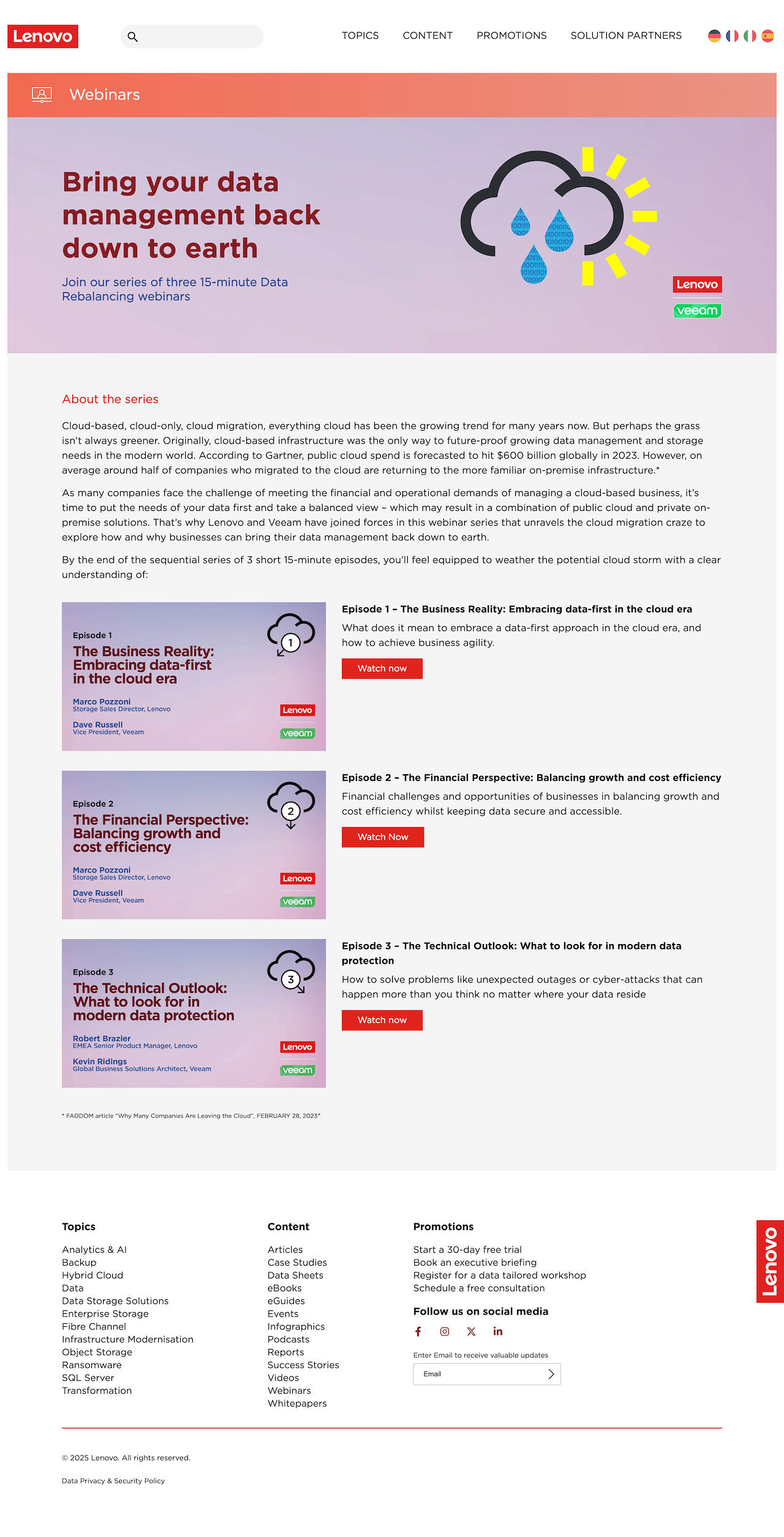 Lenovo and Veeam have teamed up for a three-part webinar series exploring the topic of data repatriation – the process of bringing data back from the cloud to local infrastructure, or combining both for optimal performance.